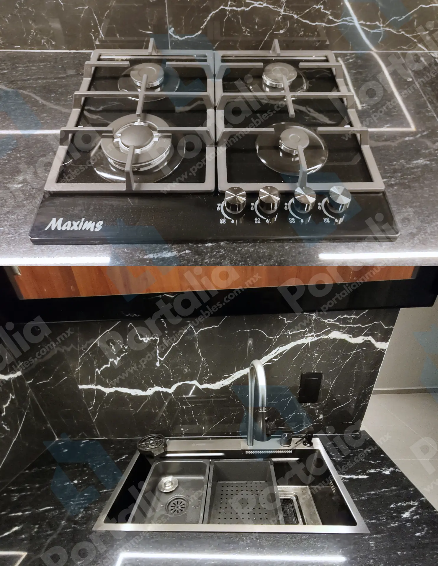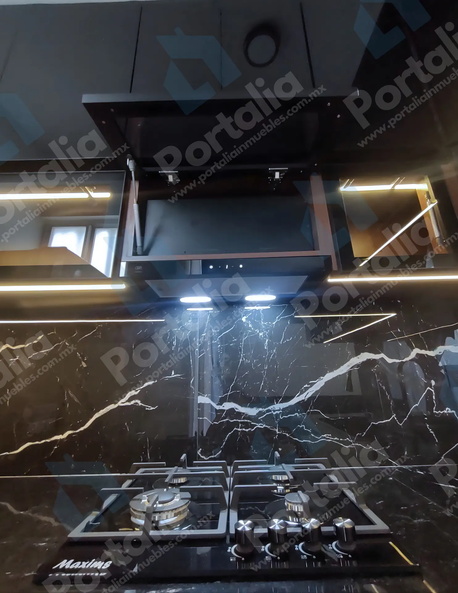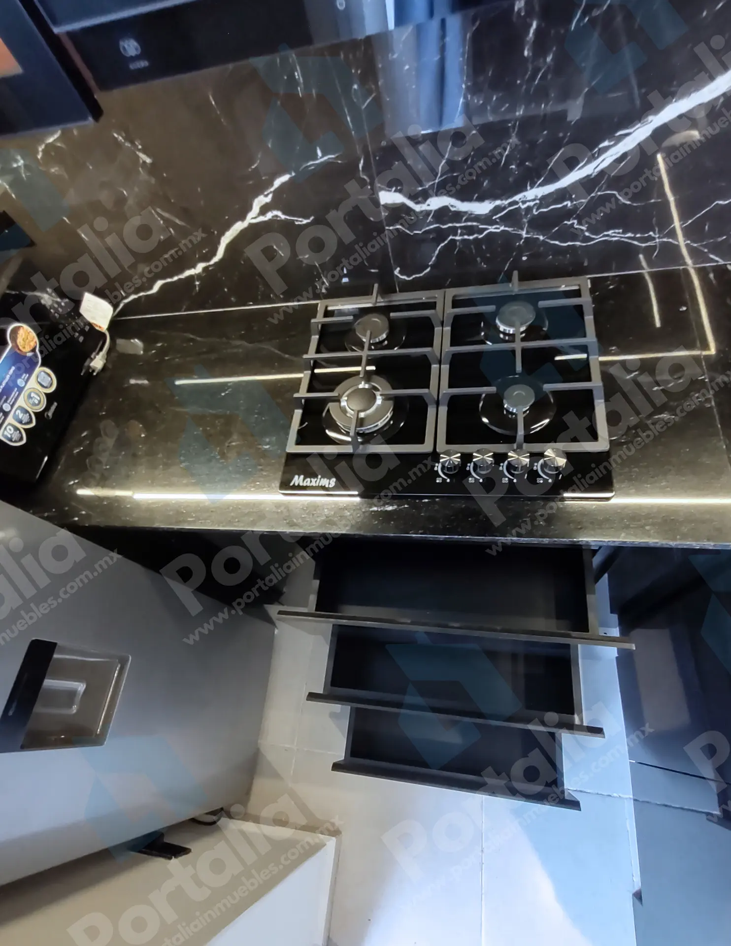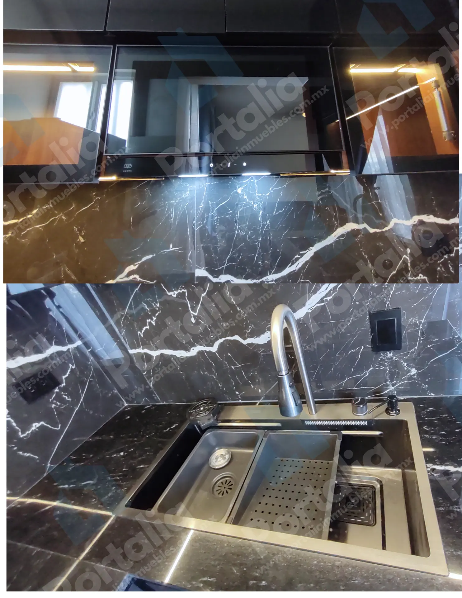 Parrilla de cuatro quemadores, horno de microondas y un fregadero multifuncional con accesorios incorporados —charola, tabla, cascada para verduras, escurridor y lava vasos— ideal para preparar y limpiar con facilidad. La campana extraíble ofrece luz LED y cuatro velocidades, con filtros de grasa y carbono para mantener el aire fresco y el espacio impecable.