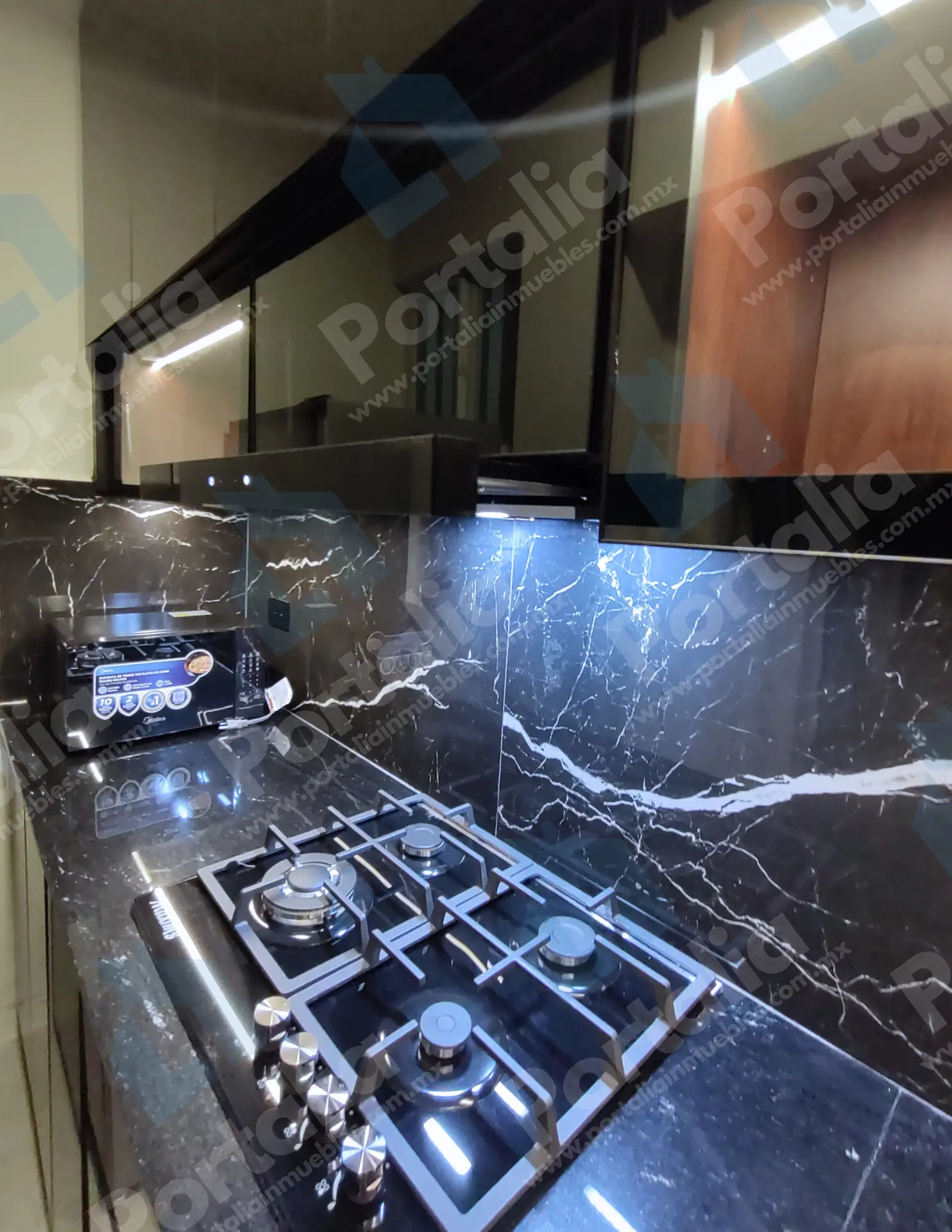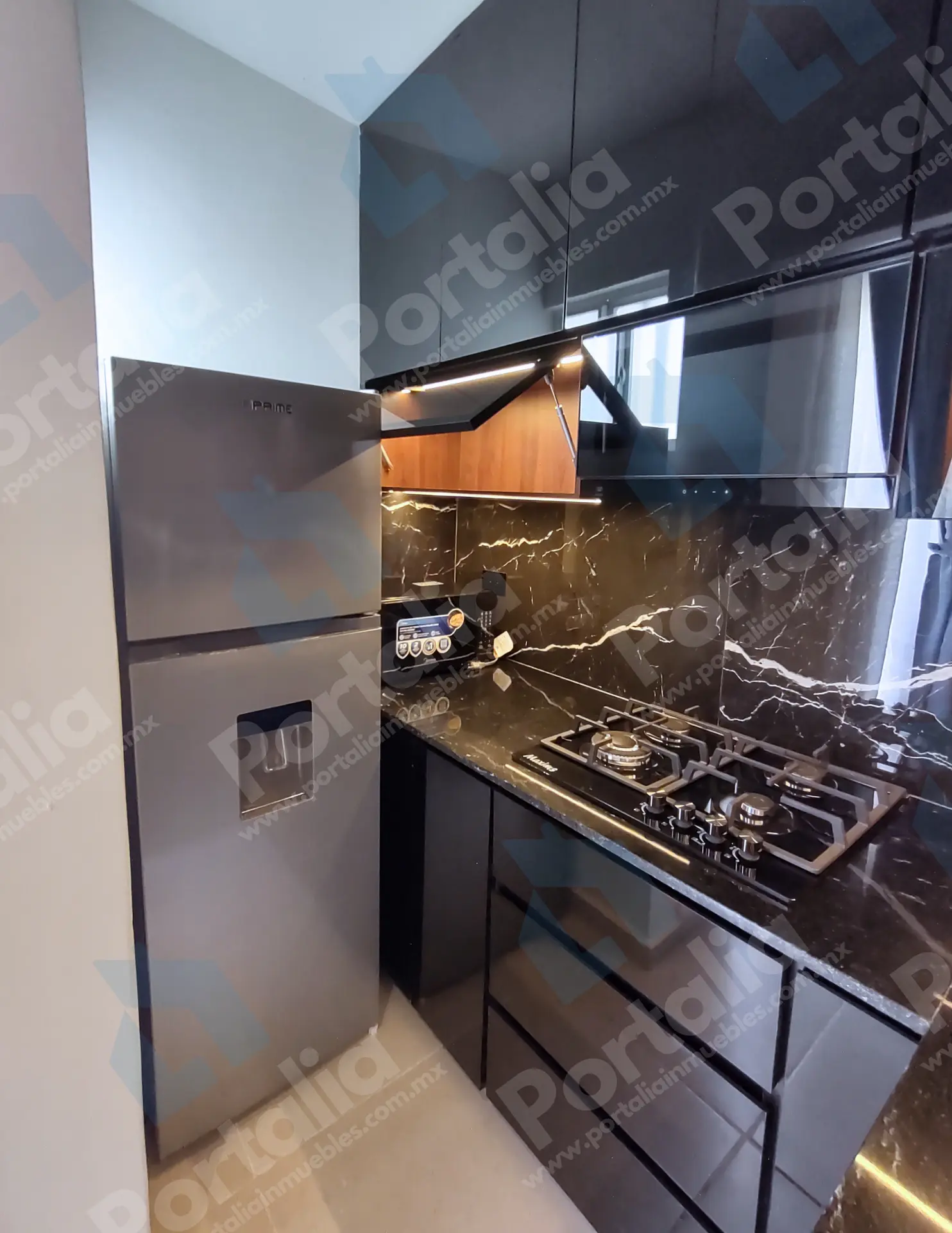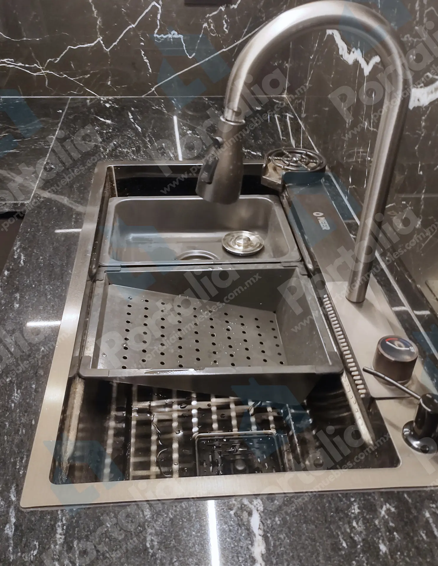 Parrilla de cuatro quemadores, horno de microondas y un fregadero multifuncional con accesorios incorporados —charola, tabla, cascada para verduras, escurridor y lava vasos— ideal para preparar y limpiar con facilidad. La campana extraíble ofrece luz LED y cuatro velocidades, con filtros de grasa y carbono para mantener el aire fresco y el espacio impecable.