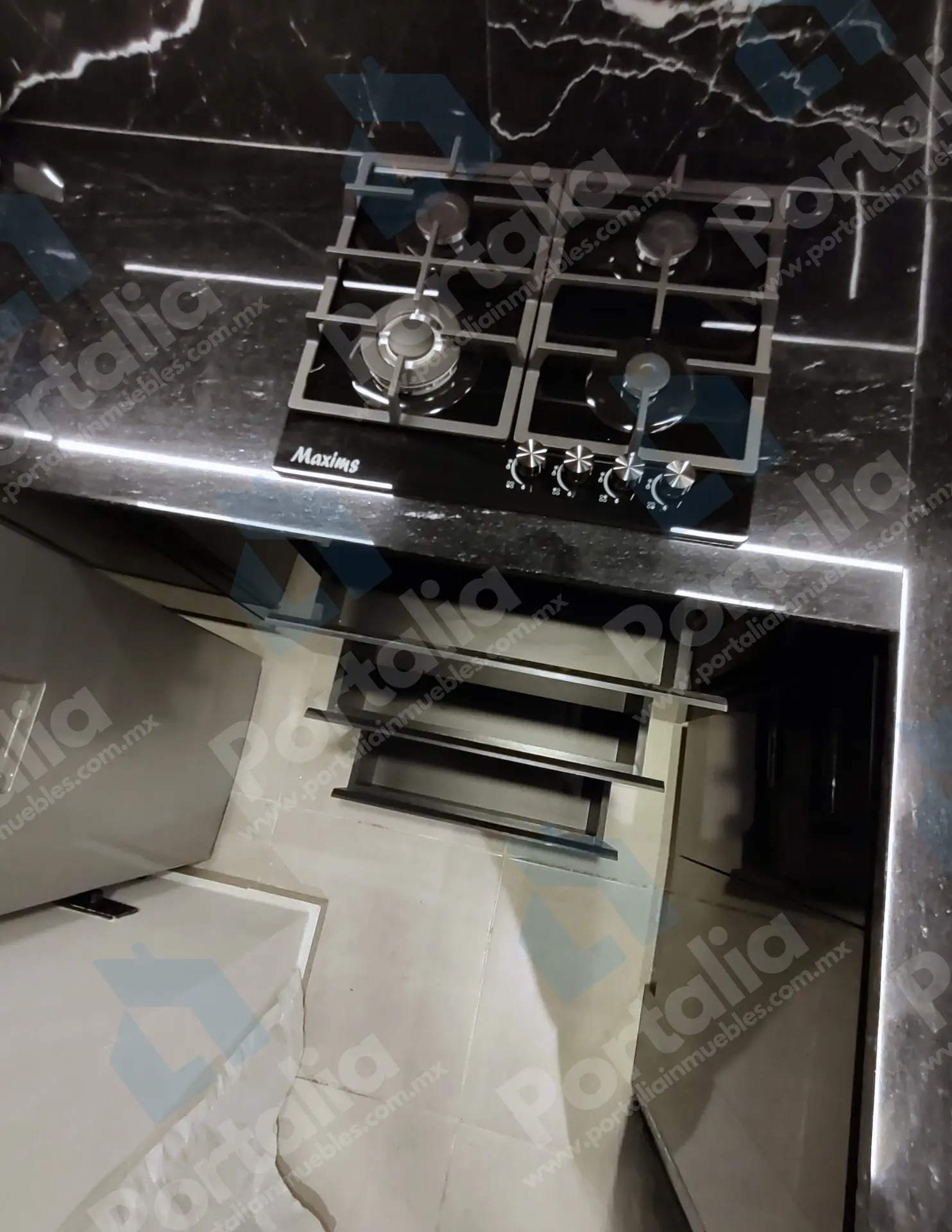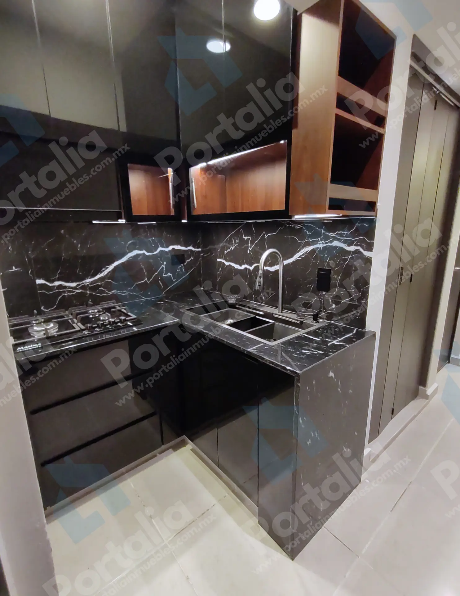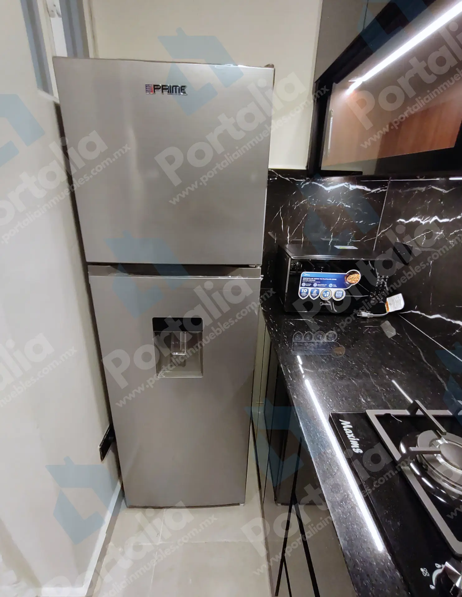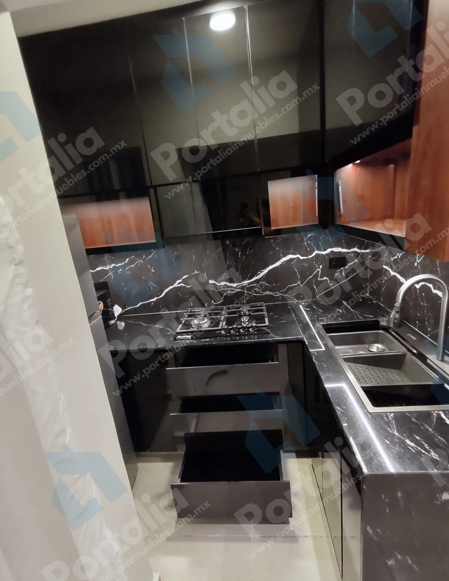 Parrilla de cuatro quemadores, horno de microondas y un fregadero multifuncional con accesorios incorporados —charola, tabla, cascada para verduras, escurridor y lava vasos— ideal para preparar y limpiar con facilidad. La campana extraíble ofrece luz LED y cuatro velocidades, con filtros de grasa y carbono para mantener el aire fresco y el espacio impecable.